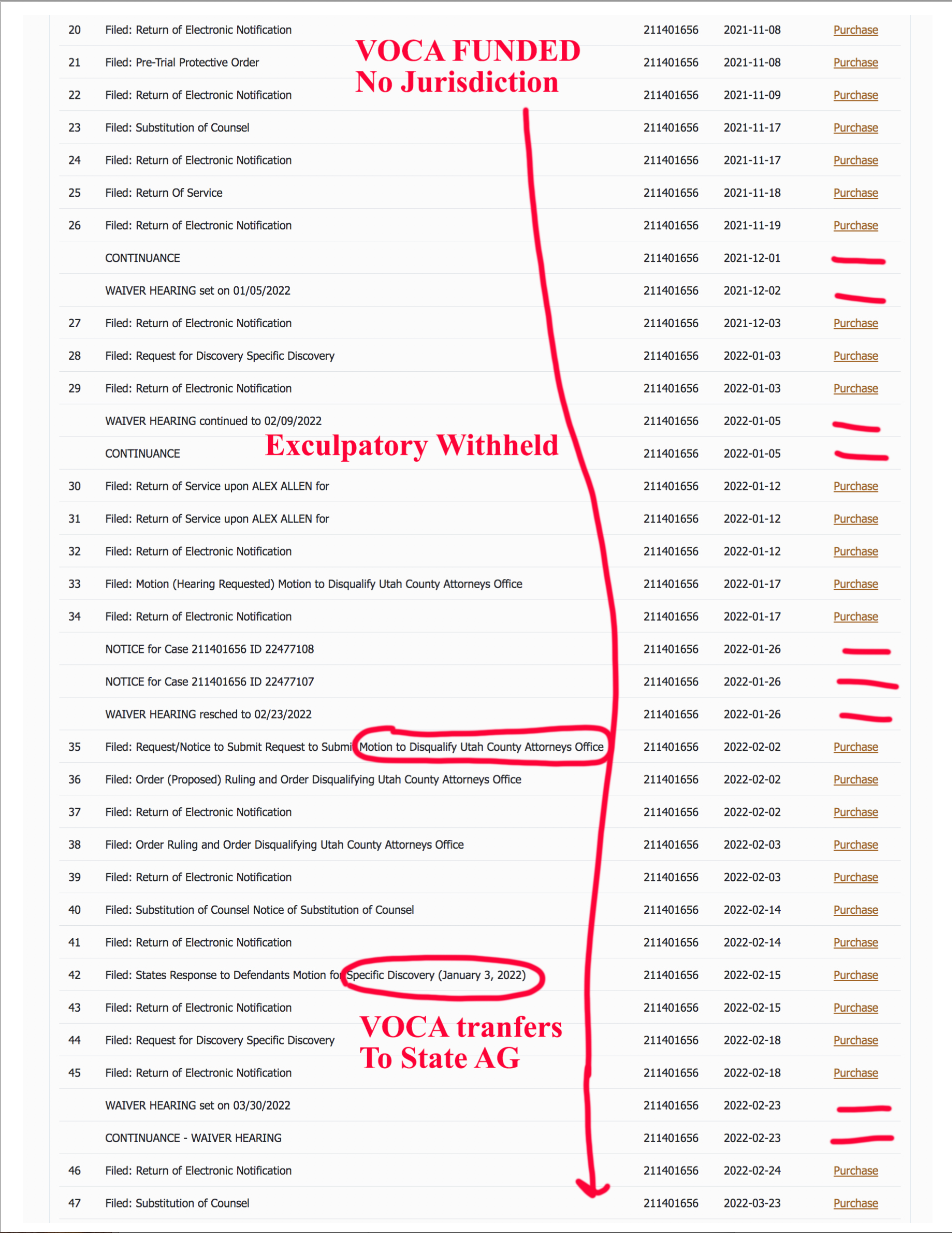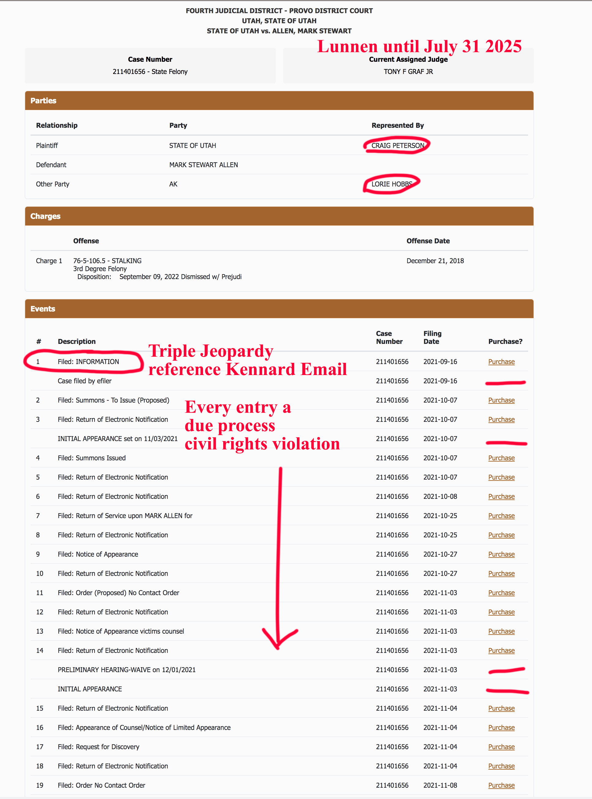 - Allowed “tolling” motion without confirming jurisdiction and allowed Leavitt to eventually violate Allen’s First Amendment Rights when he instructed subordinate Rhonda Gividen to refile duplicated case 211401656.