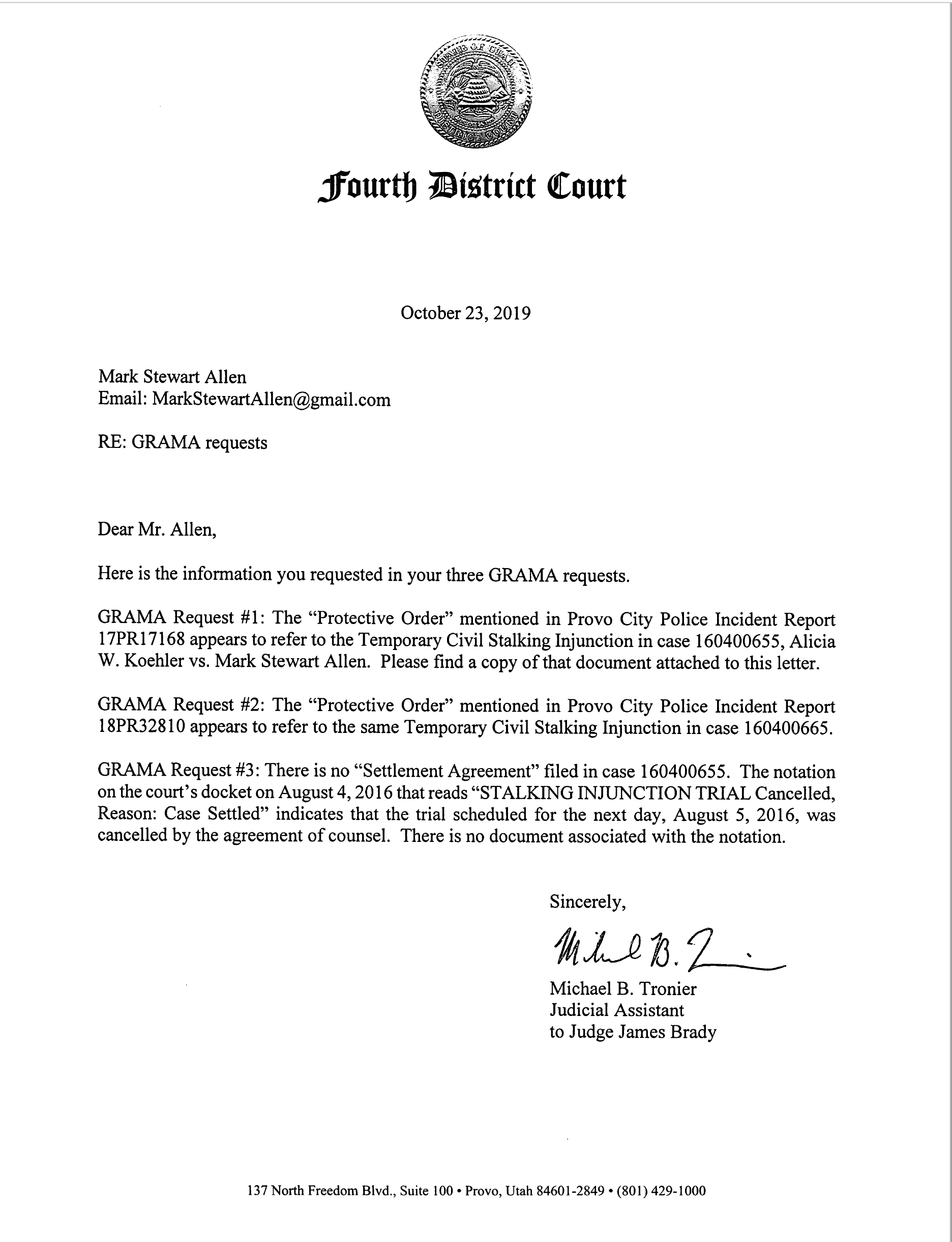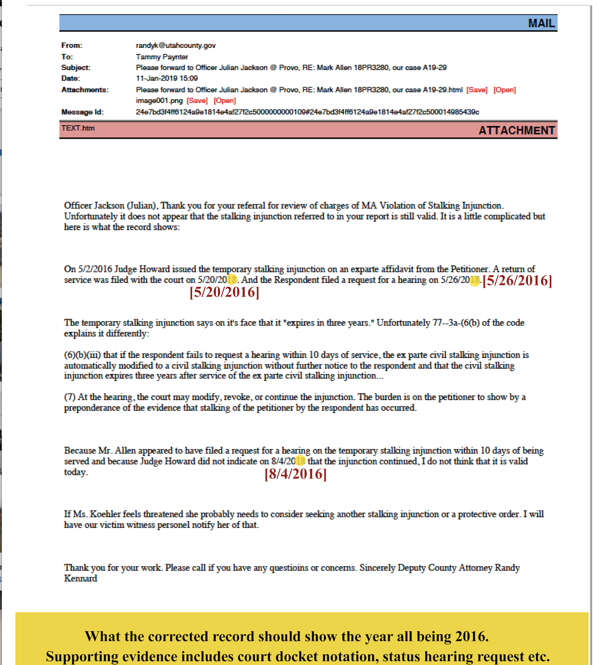 Records later obtained by Allen reveal that as early as August 2016 — and again in a January 2019 declination email from Deputy County Attorney Randy Kennard to Provo police — prosecutors inside Leavitt’s office had concluded the underlying civil stalking injunction was legally invalid: Allen had timely requested a hearing, the August 4, 2016 docket entry read “Trial Cancelled: Case Settled,” and no judge ever issued a continuation order, stripping the court of further jurisdiction.