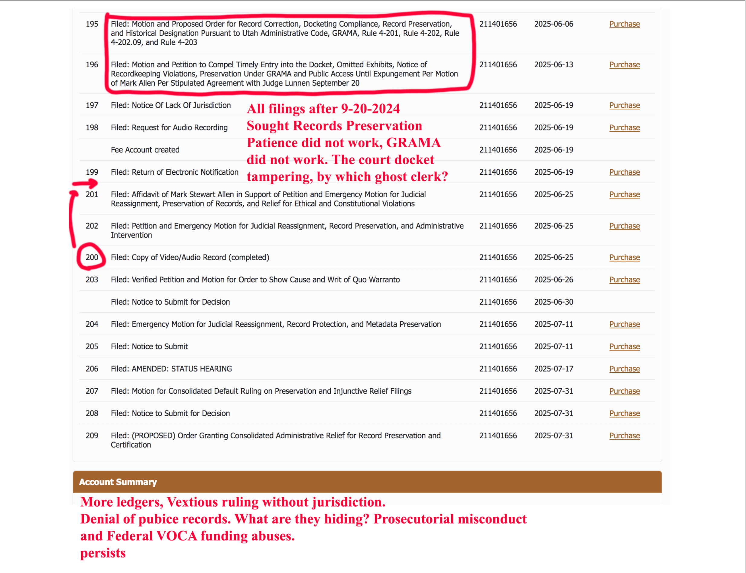 Security footage Allen later obtained and posted online shows no disturbance whatsoever. (See videos below) He had also requested whistleblower protection which the court ignored. The trespass order came one day after he flagged possible VOCA fraud and docket tampering. In short: he asked for public records. They locked him out of every courthouse in the district and, within a week, Judge Graf branded him vexatious. In actuality, one could argue the Utah Court System has been vexatious.