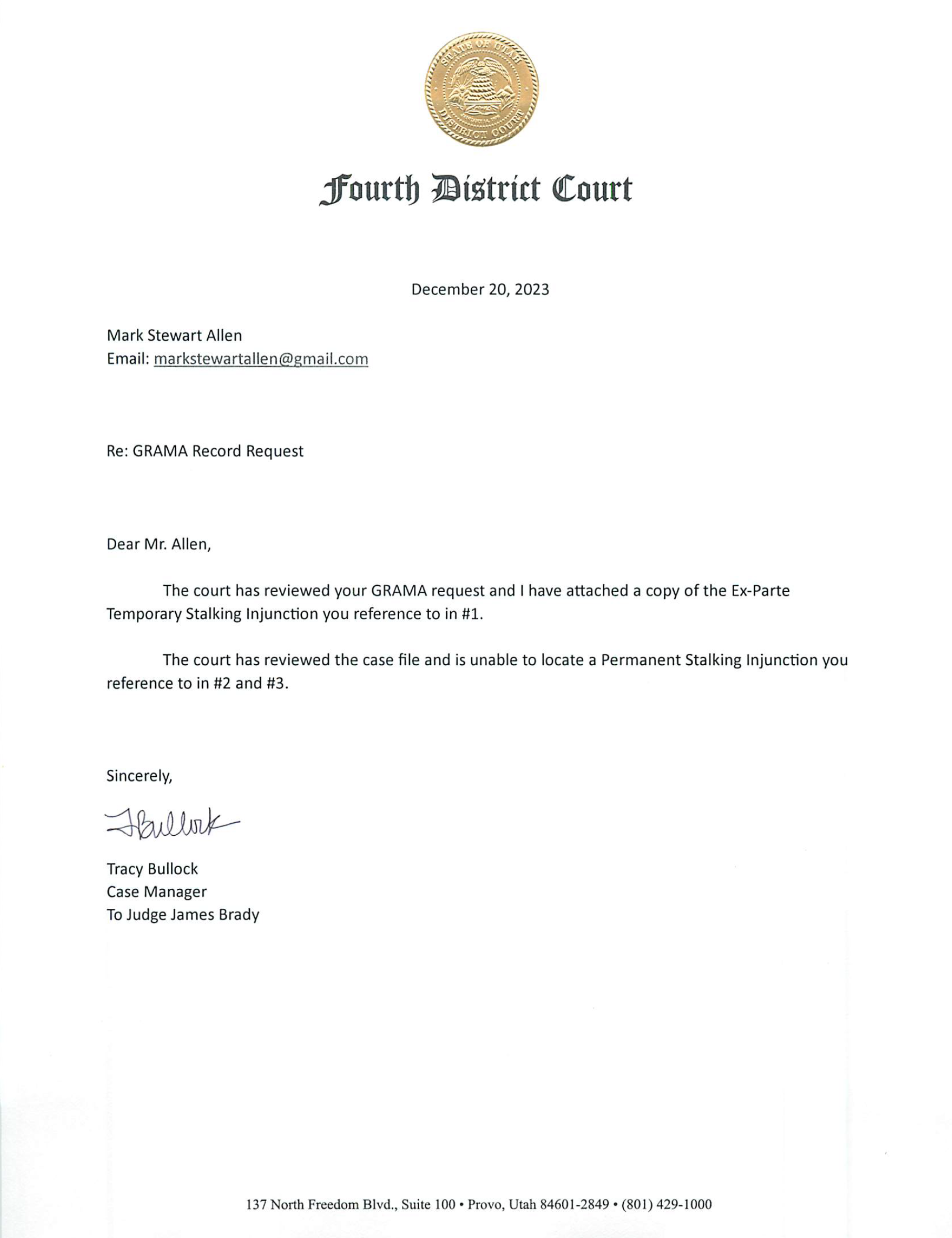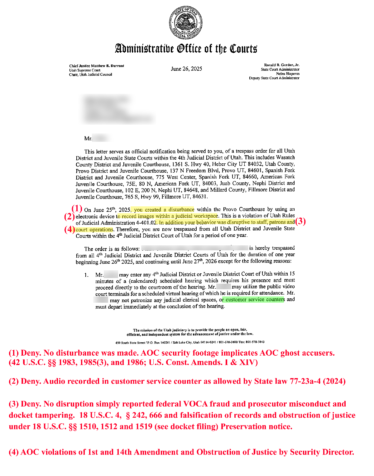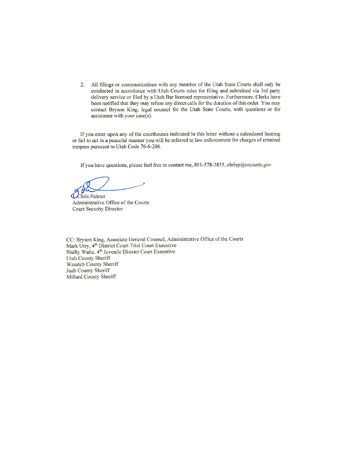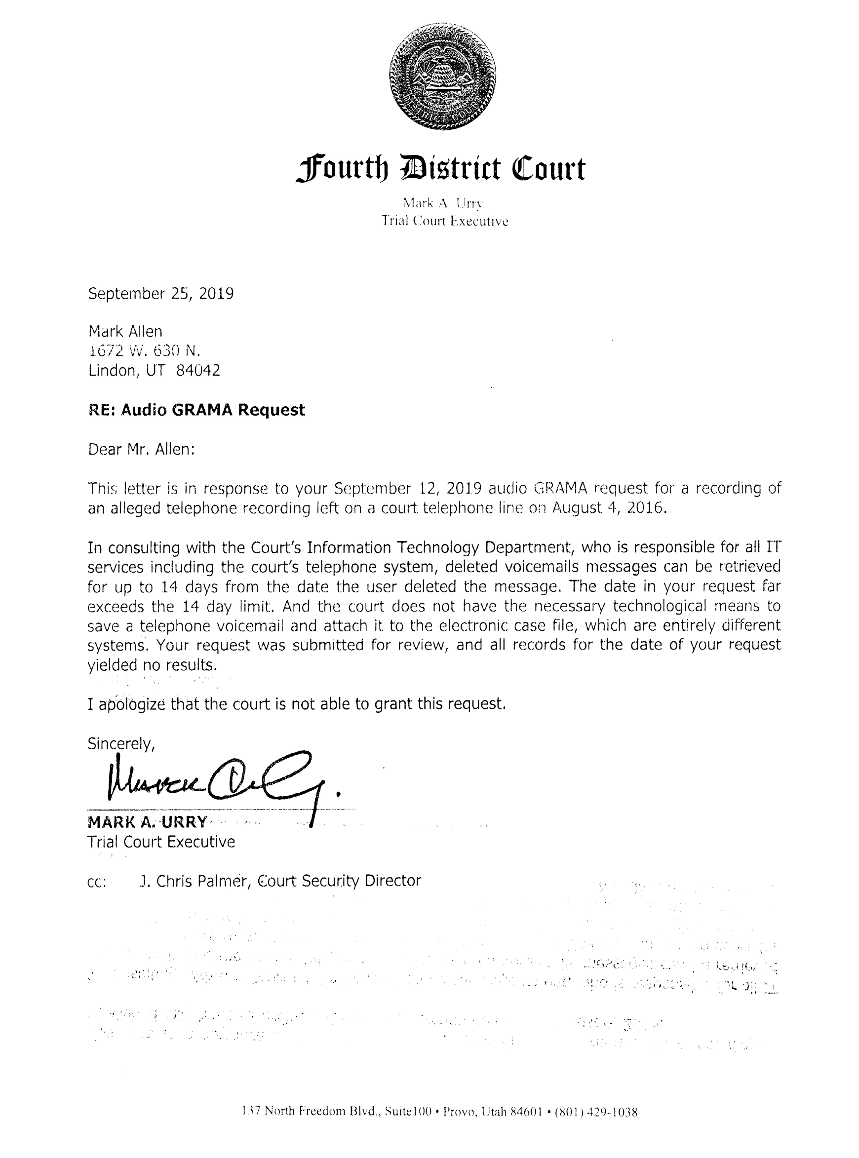 The next day he electronically filed a transcript of the conversation, in which the clerk suggested records may have been destroyed and blamed the Attorney General’s office. Twenty minutes later, Chris Palmer, Director of Security for the Utah Administrative Office of the Courts, issued a criminal trespass notice banning Allen from all eleven Fourth District courthouses for one year and circulated his personal information to four sheriff’s offices and court houses. Palmer’s letter, emailed and cc’d to other 11 courts and 4 county sheriff departments falsely accused and claimed Allen had been “using an electronic device to record images within a judicial workspace” and that his behavior “was disruptive to staff, patrons and court operations.”