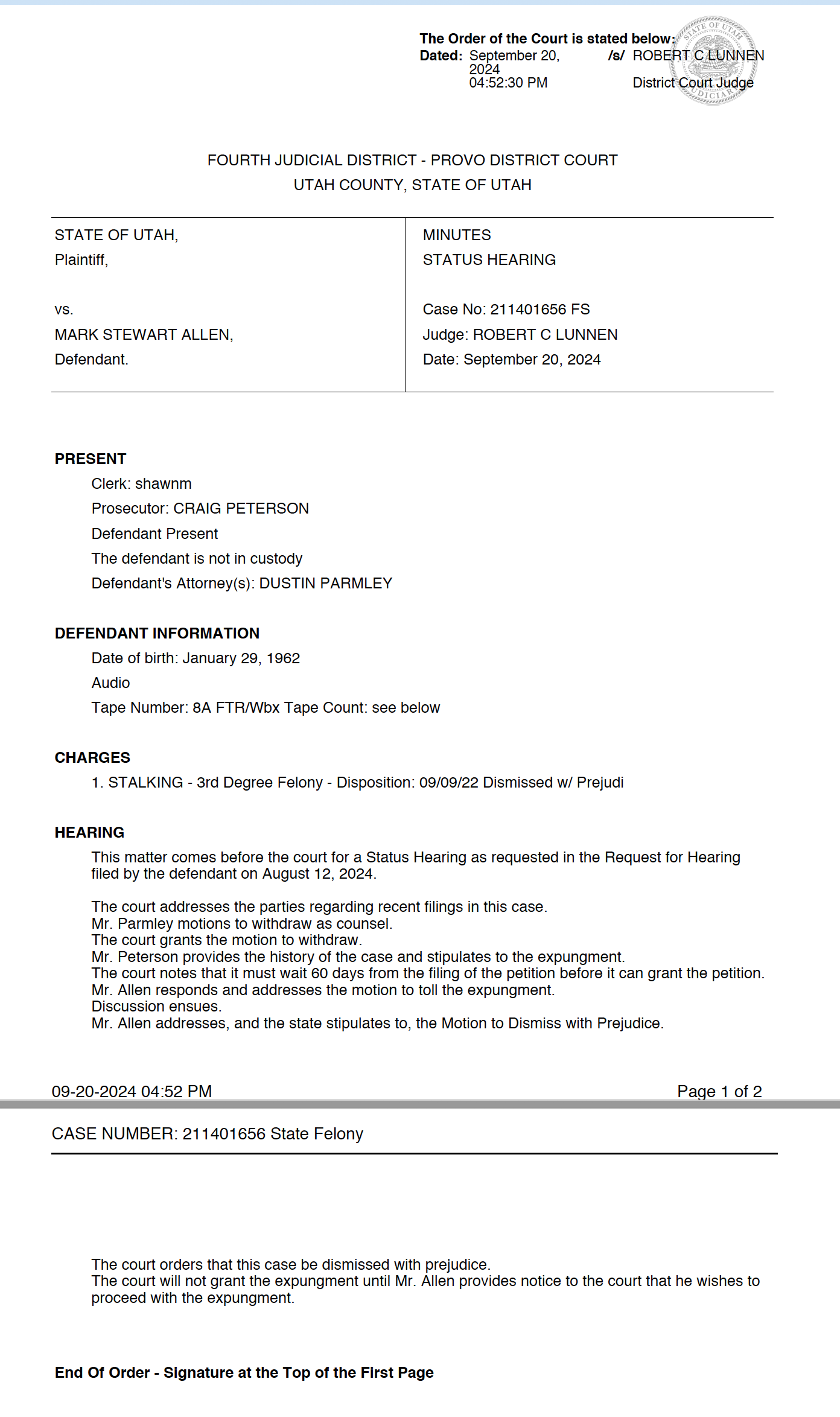 - Moved to expunge the case to seal the case history. Allen moved to Toll or Stay the Expungement to Preserve Evidence for Federal Screening