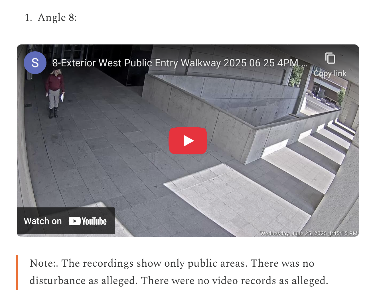 Note:. The recordings show only public areas. There was no disturbance as alleged. There were no video records as alleged.
