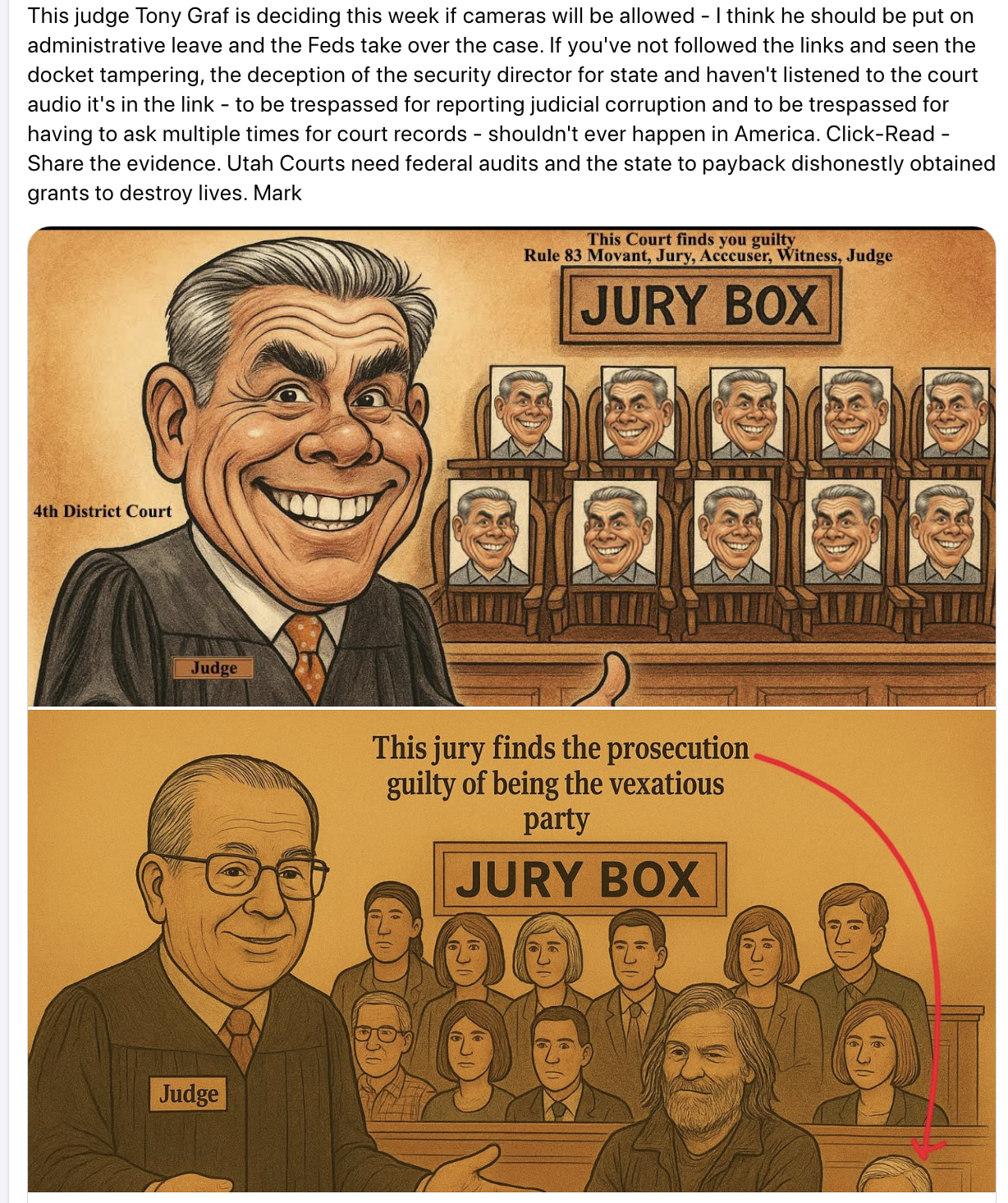 His words mirror the experience of long-time State and county delegate, Mark Stewart Allen, who, under newly appointed and inexperienced Judge Graf, was branded a “vexatious litigant” after years of alleging systemic retaliation in Utah’s Fourth District. After reviewing Allen’s documents as a non-lawyer relying only on common sense, the patterns are unmistakable: withheld exculpatory evidence, docket tampering, misuse of federal VOCA funds, perjury, custodial interference, and political weaponization of the justice system by prosecutors past and present—including former Utah County Attorney David Leavitt and the current team of Jeff Gray and Lauren Hunt (all involved in Tyler Robinson’s trial)—under judges and county leaders and police who refused to correct or amend to make accurate the court and police records. This is a big deal!